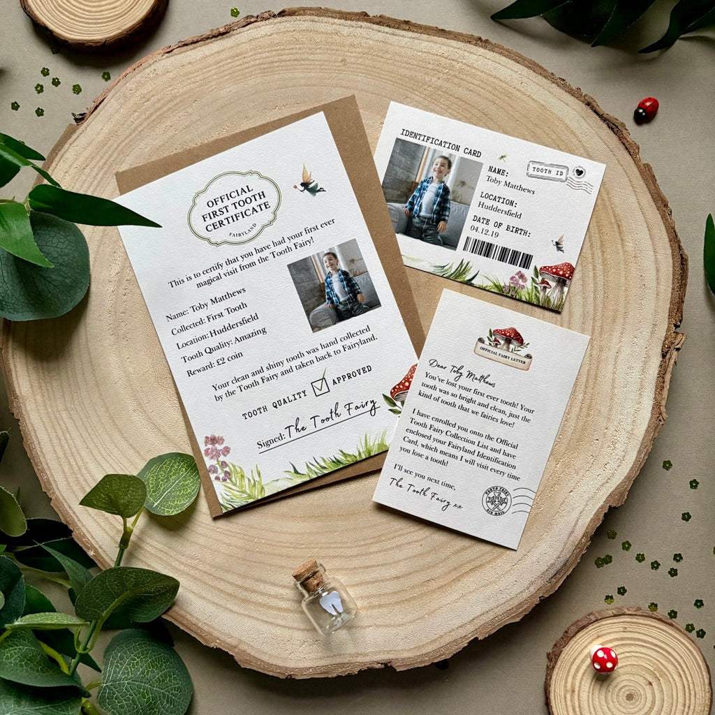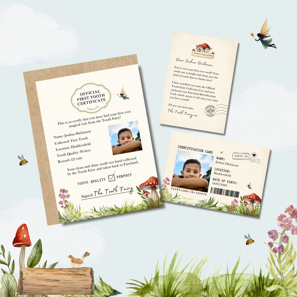 This magical bundle from Fairyland includes a miniature personalised letter from the Tooth Fairy, a personalised Official First Tooth Certificate and a personalised Fairyland Identification Card all carefully packaged into an envelope! Designed to add some extra magic to their first ever tooth loss.